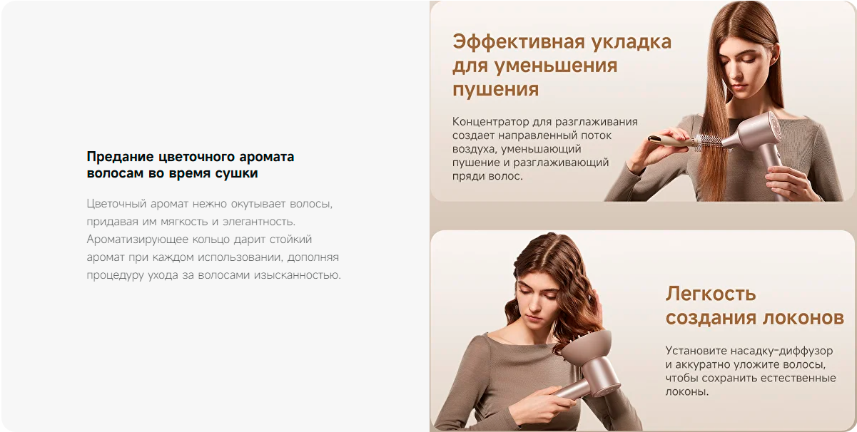 Встроенный генератор ионов помогает снизить статическое электричество, делая волосы более гладкими и послушными. Это особенно заметно при ежедневной сушке и укладке, когда важно сохранить аккуратный внешний вид причёски.