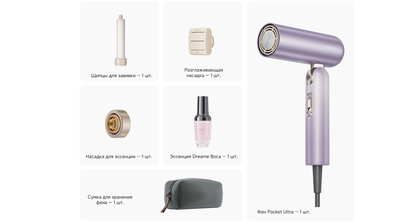 Dreame Pocket Ultra High-speed — это не просто фен, а настоящий бьюти-гаджет нового поколения. Компактный, лёгкий и технологичный, он превращает сушку и укладку волос в быстрый, удобный и бережный процесс. В нём сочетаются продуманный дизайн, высокая мощность и набор уникальных насадок, которые открывают новые возможности для ухода.